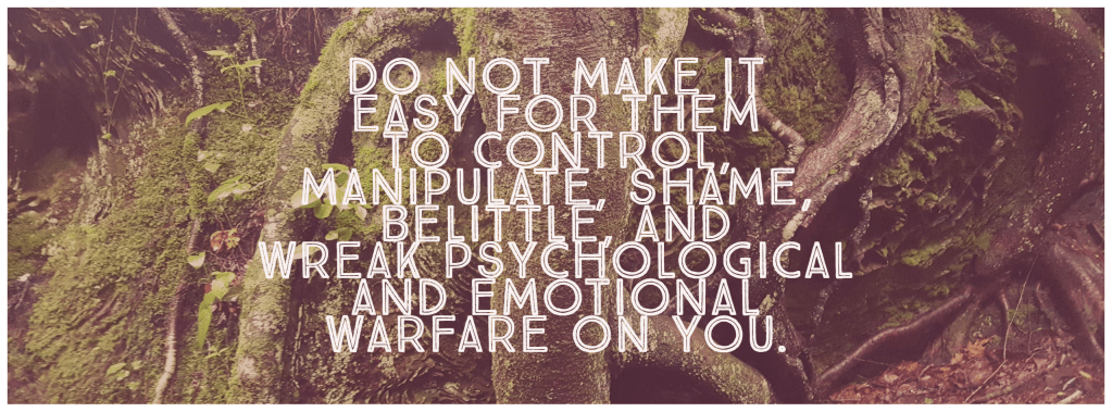 DO NOT make it easy for them to control, manipulate, shame, belittle, and wreak psychological and emotional warfare on you.