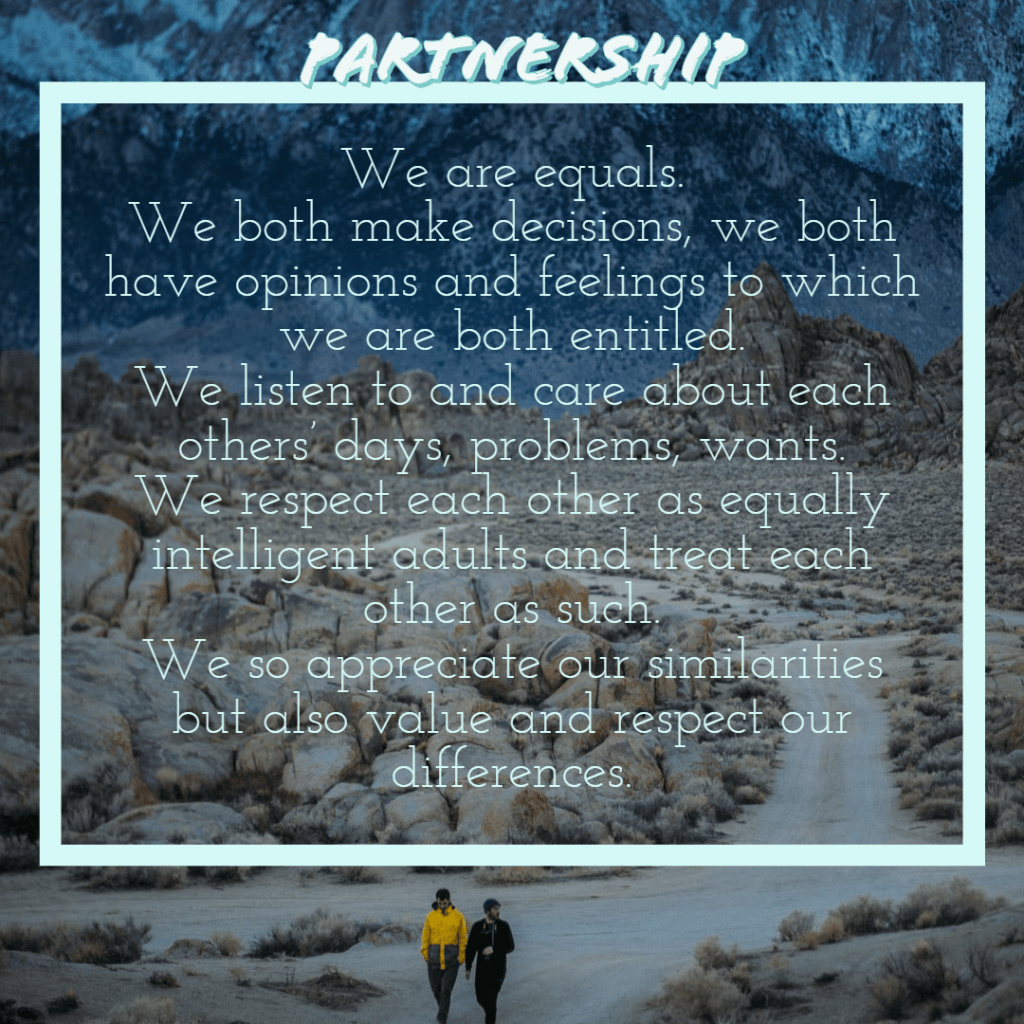 We are equals. We both make decisions, we both have opinions and feelings to which we are both entitled. We listen to and care about each others’ days, problems, wants. We respect each other as equally intelligent adults and treat each other that way. We so appreciate our similarities but also value and respect our differences. We deeply love and delight in each other – there is no belittling, berating, insulting, disrespecting, screaming…instead there is patience, thoughtful conversation, and yes at times we fight but we fight fair and take our time outs to calm down so we avoid saying anything too harsh. And never – not once – has my husband made me feel like I need to change, like I am less than, or wrong. He loves me just the way I am. It was – and sometimes still is – incredible to me!