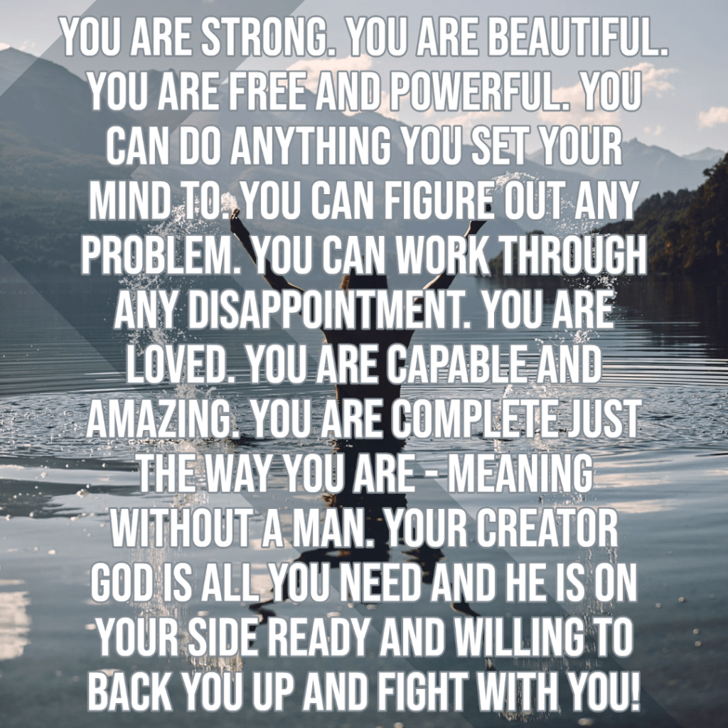You are strong. You are beautiful. You are free and powerful. You can do anything you set your mind to. You can figure out any problem. You can work through any disappointment. You are loved. You are capable and amazing. You are not an object here for anyone’s use, but an equal member of the human race. You are complete just the way you are – meaning without a man. Your creator God is all you need and He is on your side ready and willing to back you up and fight with you!